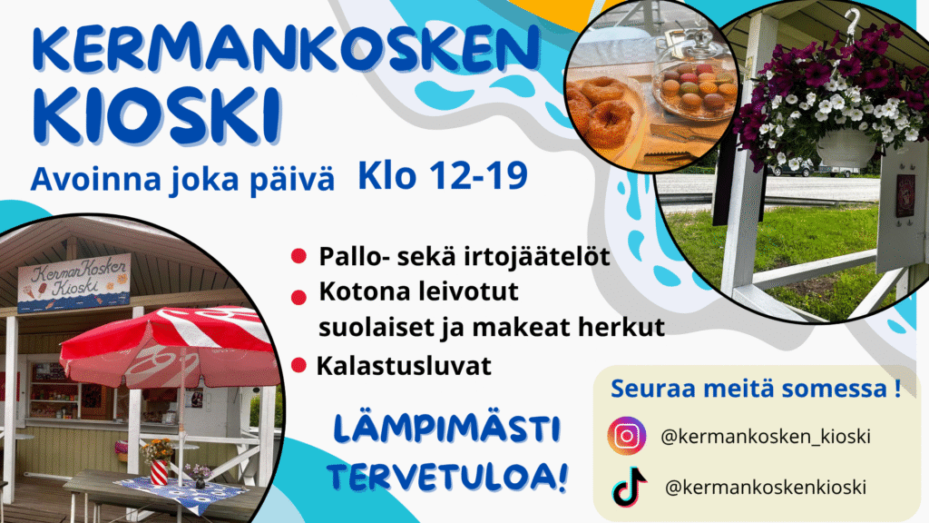 Kermankosken kioski palvelee jo 27. kesää ja on avoinna kesäkaudella päivittäin työllistäen paikallisia nuoria. Kioskilla on myynnissä pientä purtavaa, kuten jäätelöä, lihapiirakoita, kahvia ja kahvileipä sekä virvoitusjuomia. Kioskilta voit ostaa myös kalastuslupia.